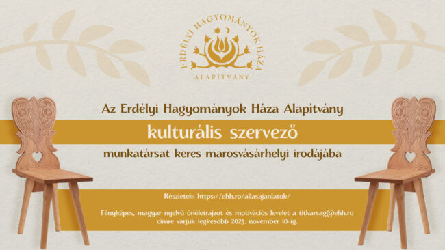 Az Erdélyi Hagyományok Háza Alapítvány munkatársat keres marosvásárhelyi irodájába KULTURÁLIS SZERVEZŐ munkakörre.