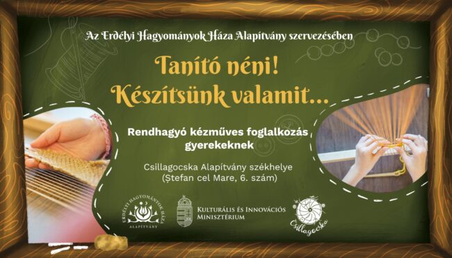Tanító néni! Készítsünk valamit… – rendhagyó kézműves foglalkozás iskolásoknak. Az Erdélyi Hagyományok Háza Alapítvány nagyváradi irodája folytatja rendhagyó kézműves programját elemi osztályos diákok számára. A foglalkozásokon a gyerekek megismerkedhetnek számos hagyományos kézműves technikák alapjaival, és betekintést nyernek ezen mesterségekbe, szakmai oktatók vezetésével. Minden pedagógus a időpont foglalásakot kiválaszthatja milyen típusú foglalkozáson szeretne résztvenni a gyermekekkel:1. Nemezelés…