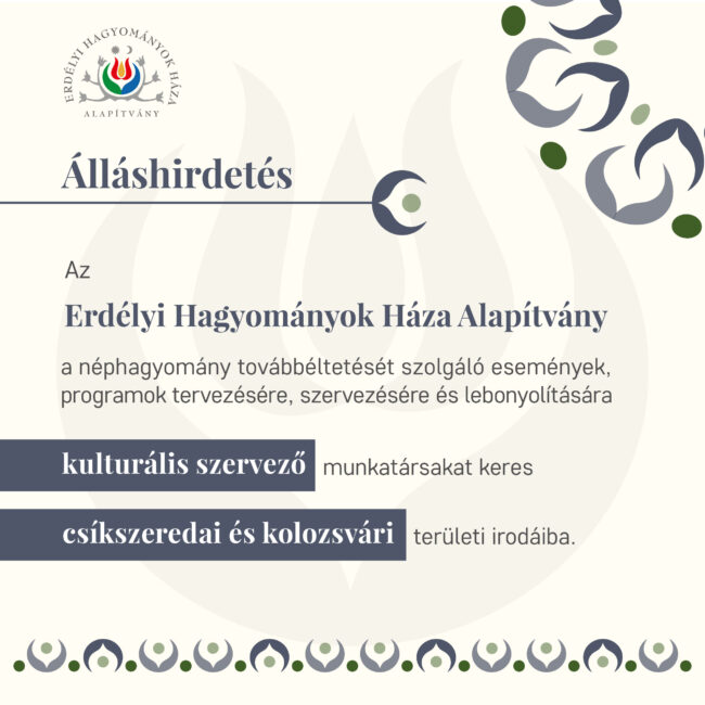 Az Erdélyi Hagyományok Háza Alapítvány munkatársat keres kolozsvári irodájába a következő munkakörre: KULTURÁLIS SZERVEZŐ Fontosabb feladatai a néphagyomány továbbéltetését alapfeladatának vállaló Alapítványnál: • a célt szolgáló események, programok tervezése, szervezése és lebonyolítása,• a megvalósításban együttműködés a budapesti Hagyományok Házával és a marosvásárhelyi központi irodával,• témafelelősként a programok, események partnereivel, résztvevőivel való kapcsolattartás,• kapcsolattartás a helyi…