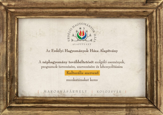 Az Erdélyi Hagyományok Háza Alapítvány munkatársat keres marosvásárhelyi irodájába KULTURÁLIS SZERVEZŐ munkakörbe.