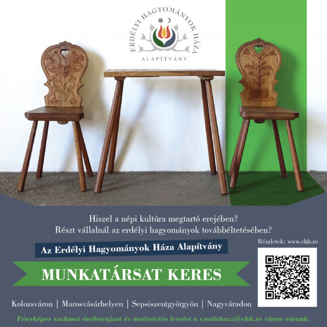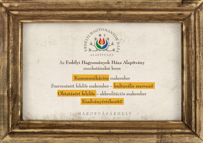 Az Erdélyi Hagyományok Háza Alapítvány munkatársakat keres marosvásárhelyi székhelyű központjába a következő munkakörökre: KOMMUNIKÁCIÓS SZAKEMBER Fontosabb feladatai a néphagyomány továbbéltetését alapfeladatának vállaló Alapítványnál: Elvárások: Előnyt jelent: SZERVEZÉSÉRT FELELŐS SZAKEMBER – KULTURÁLIS SZERVEZŐ Fontosabb feladatai a néphagyomány továbbéltetését alapfeladatának vállaló Alapítvány központi irodájában: Elvárások: Előnyt jelent: OKTATÁSÉRT FELELŐS – AKKREDITÁCIÓS SZAKEMBER Fontosabb feladatai a néphagyomány továbbéltetését…