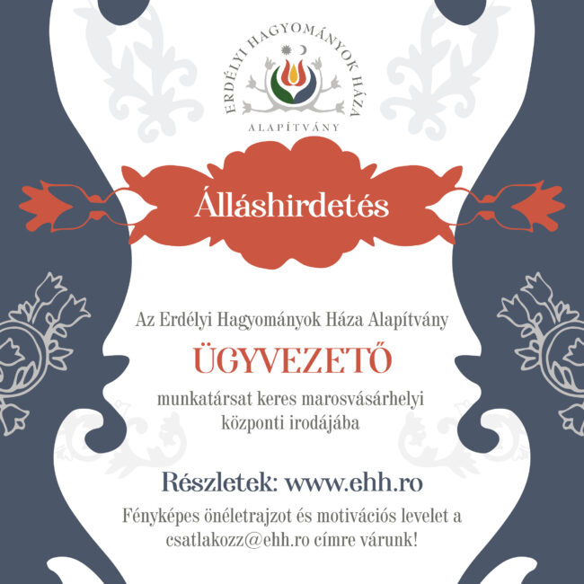 Az Erdélyi Hagyományok Háza Alapítvány marosvásárhelyi központjába keres elkötelezett, lelkes és tapasztalt ügyvezetőt, aki támogatja és együttműködik az alapítványi elnökkel a célok elérésében és a hatékony működés érdekében. Felelősségi körök és feladatok: Elvárások: Amit kínálunk: Az Alapítvány tevékenységéről információk az www.ehha.ro weboldalon és az Erdélyi Hagyományok Háza közösségi oldalain találhatók. Amennyiben érdekli ez a pozíció,…