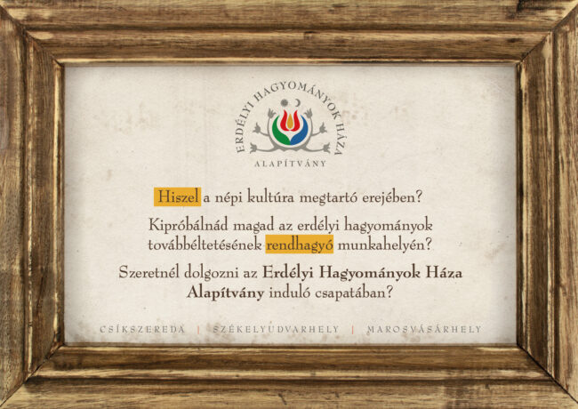 Az Erdélyi Hagyományok Háza irodavezetőket keres a csíkszeredai, székelyudvarhelyi, marosvásárhelyi, most alakuló területi irodáiba. Az irodavezető főbb feladatai: Elvárások: Előnyt jelent: Fényképes, magyar nyelvű önéletrajzodat és motivációs leveledet várjuk a csatlakozz@ehh.ro címre 2021. február 24-ig.