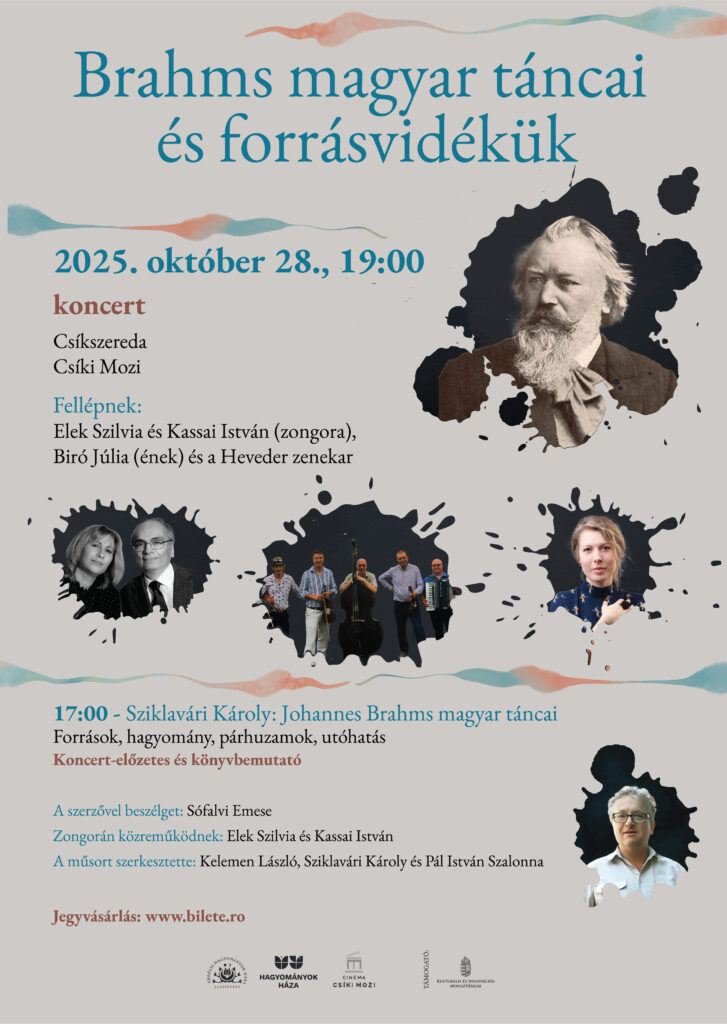 A könyvbemutatóra a belépés ingyenes! Jegyek a csíkszeredai koncertre a bilete.ro oldalon: Brahms magyar táncai és forrásvidékük