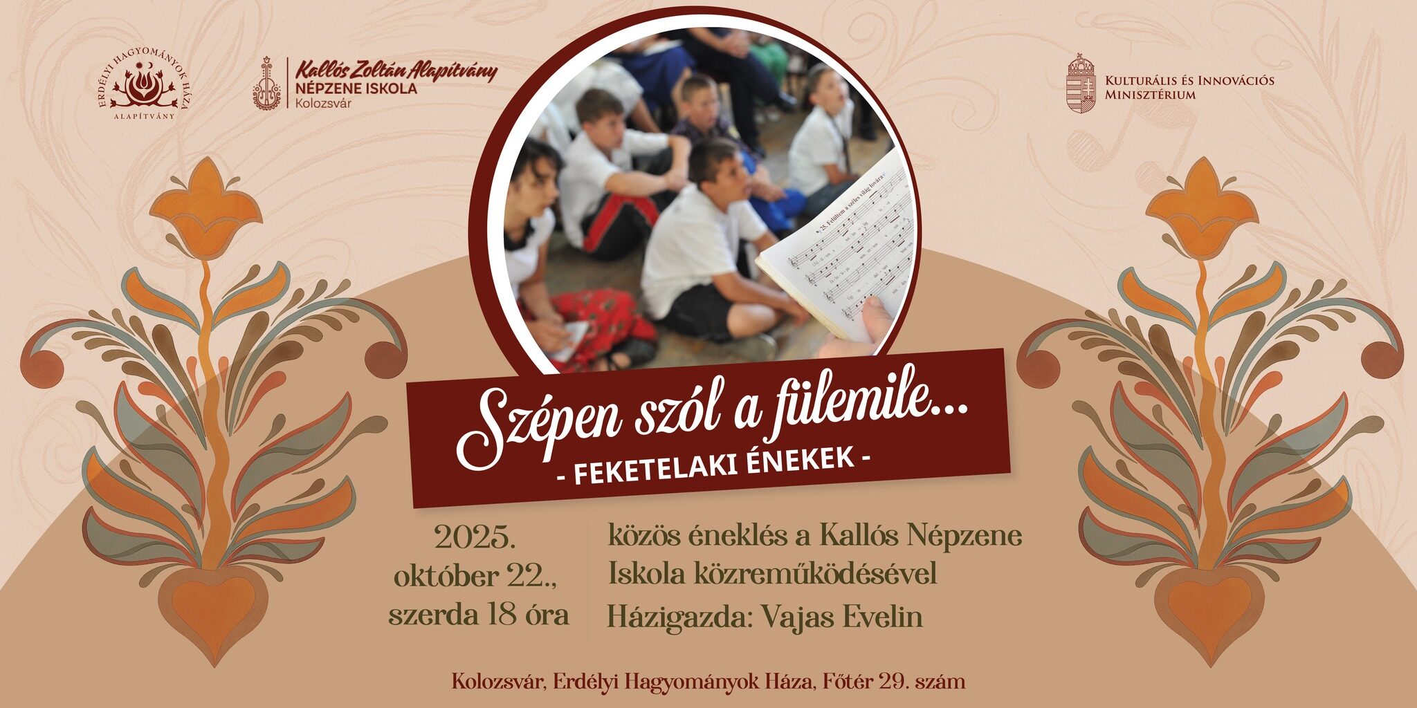 A hagyomány éltetésének egyik eszköze, ha minél többet és minél többen énekelünk, zenélünk. Ezért folytatjuk a népének és népdaléneklő programunkat új címmel – Szépen szól a fülemile… – a Kallós Zoltán Népzene Iskola közreműködésével. Az évad első alkalmán feketelaki énekeket tanulhatnak az érdeklődők.