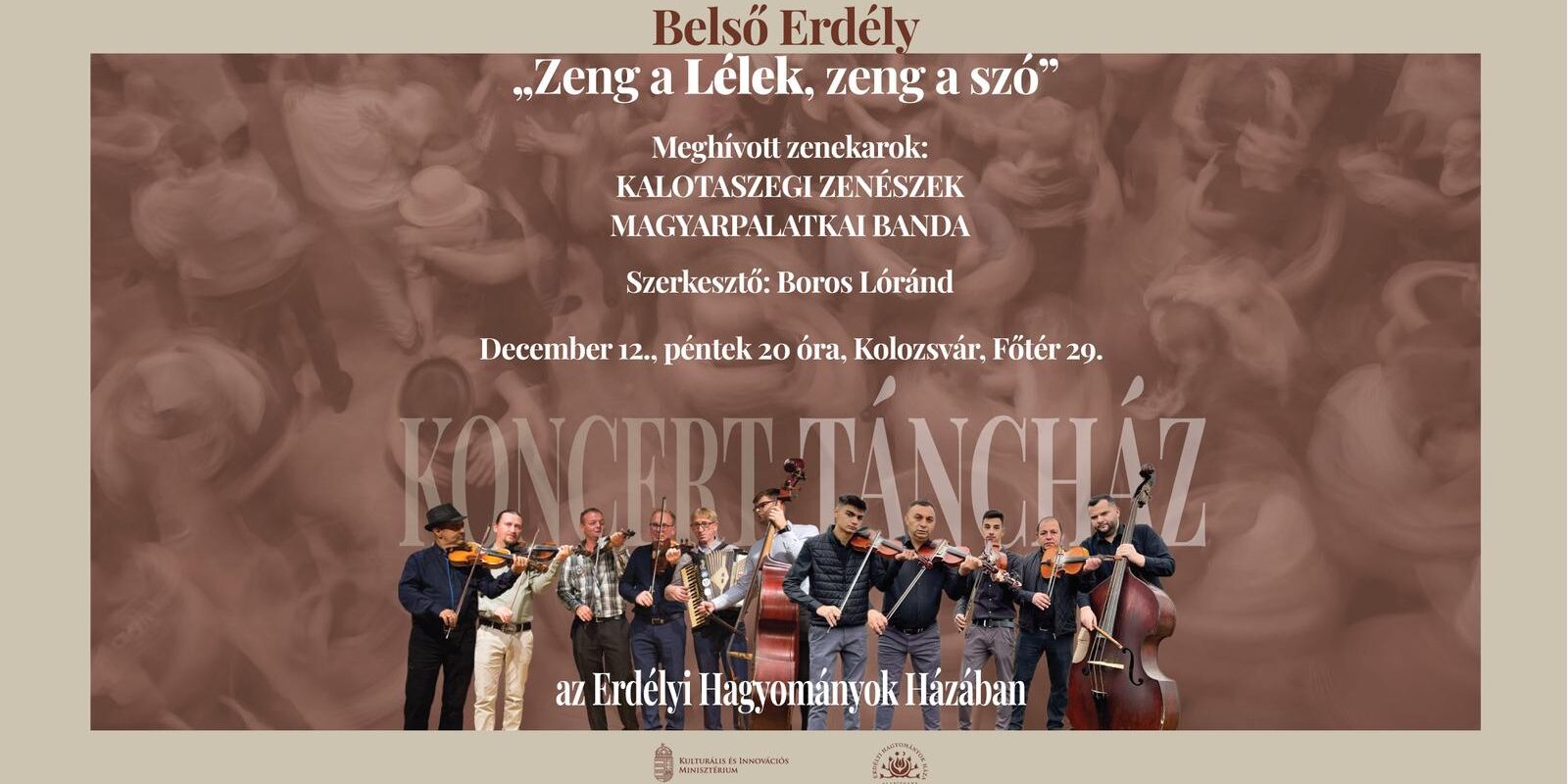Fokozzuk egy kicsit a „belső” élményt! Mezőségről, a Belső-mezőségi zenész központból, Magyarpalatka községből a Palatkai Banda érkezik, míg az alapvetően Kalotaszeg nádasmenti részéről származó zenészek a felszegi, bánffyhunyadi Varga István „Kiscsipás”-sal egészülnek ki, és varázsolják a december 12-i péntek esténket egy felejthetetlen mágikus élménnyé!