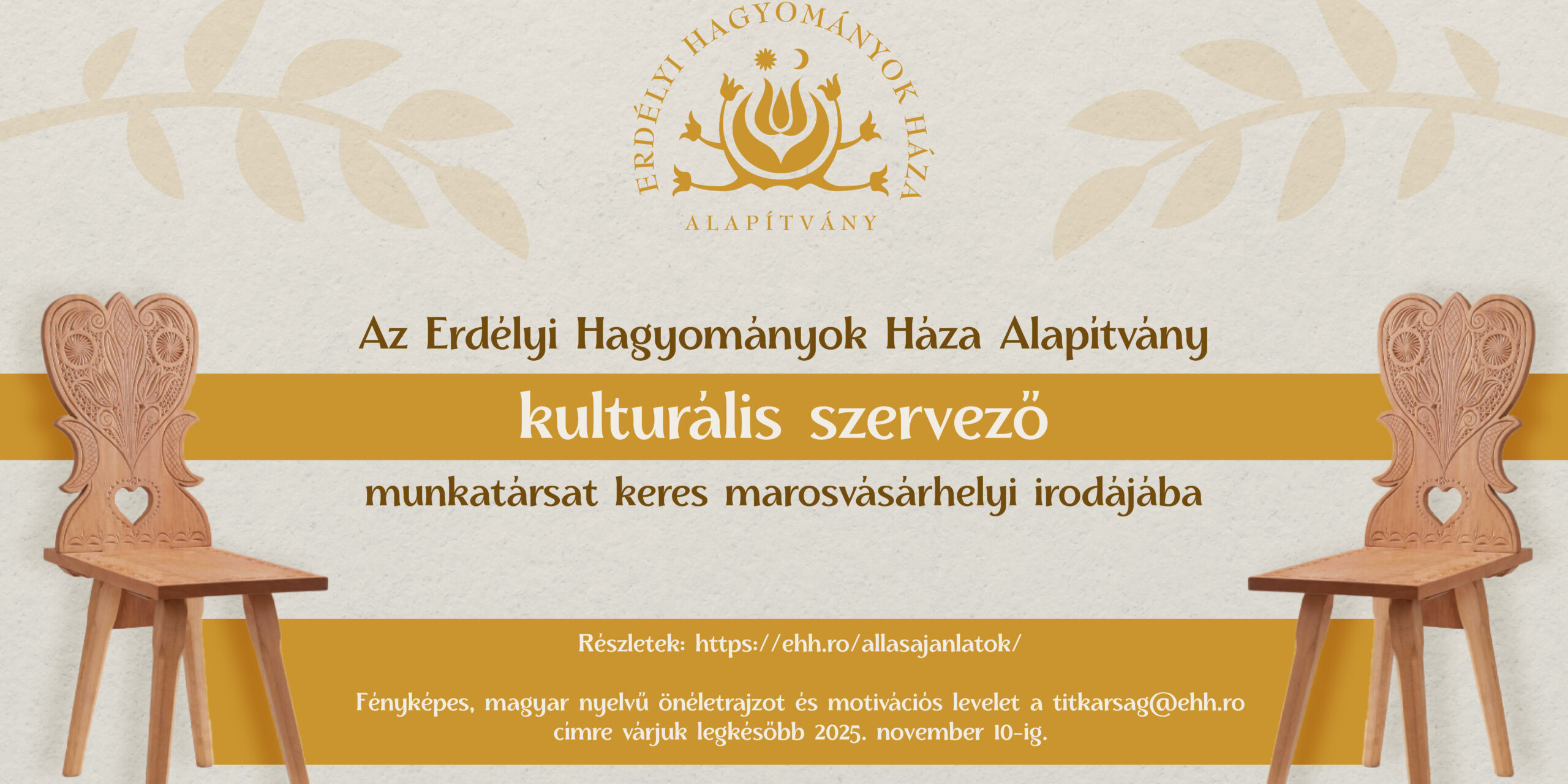 Munka kezdete: 2025. december 1.Fényképes, magyar nyelvű önéletrajzot és motivációs levelet várunk a titkarsag@ehh.ro címre legkésőbb 2025. november 10-ig.