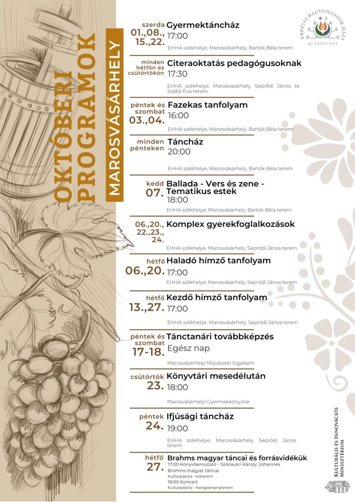 A hónap kulturális csemegéje az október végén megvalósuló Brahms magyar táncai és forrásvidékük című koncertturné, amelyet négy városban megelőz egy koncert-előzetes és könyvbemutató. A koncertsorozat ősbemutatója október 25-én Kolozsváron lesz, a hajdani Redout (Vigadó) épületében (ma Erdélyi Néprajzi Múzeum), ahol annak idején maga Brahms is játszott. Ezt követik a székelyudvarhelyi (okt. 26.), marosvásárhelyi (okt. 27.), csíkszeredai (okt. 28.) koncertek. A könyvbemutatókon és a koncerteken részt vesz Sziklavári Károly, a könyv szerzője, fellépnek Biró Júlia és a Heveder zenekar, a négy kezet zongorán Elek Szilvia és Kassai István neves zongoraművészek adják. (Részletek hamarosan.)