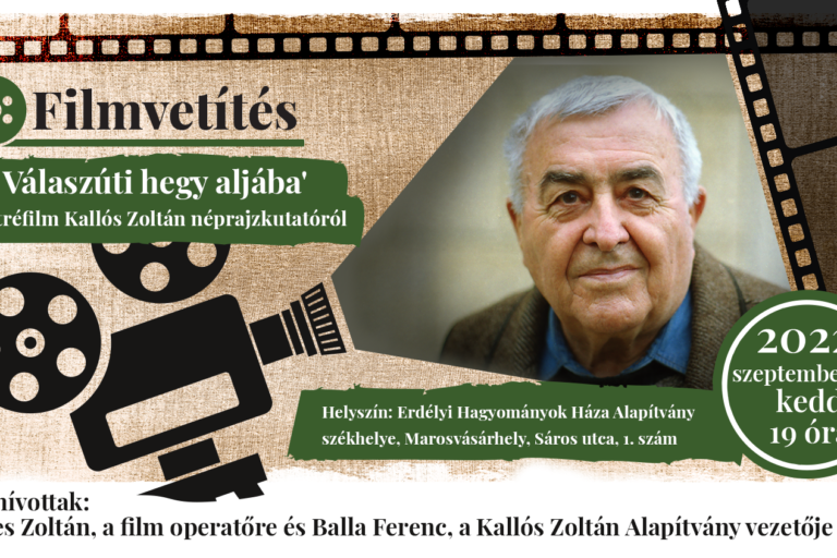 Újra indulnak filmklub alkalmaink a nyári szünet után Marosvásárhelyen.. A szeptemberi filmvetítésen a Válaszúti hegy aljába’ című, Kallós Zoltán néprajzkutatóról szóló portréfilmet mutatjuk be a nagyközönségnek. Az eseményre 2022. szeptember 27-én 19 órától kerül sor az alapítvány marosvásárhelyi székhelyén (Sáros utca/Târgului 1. szám), a részvétel ingyenes. A filmvetítést beszélgetés követi meghívottainkkal: Dénes Zoltánnal, a film…