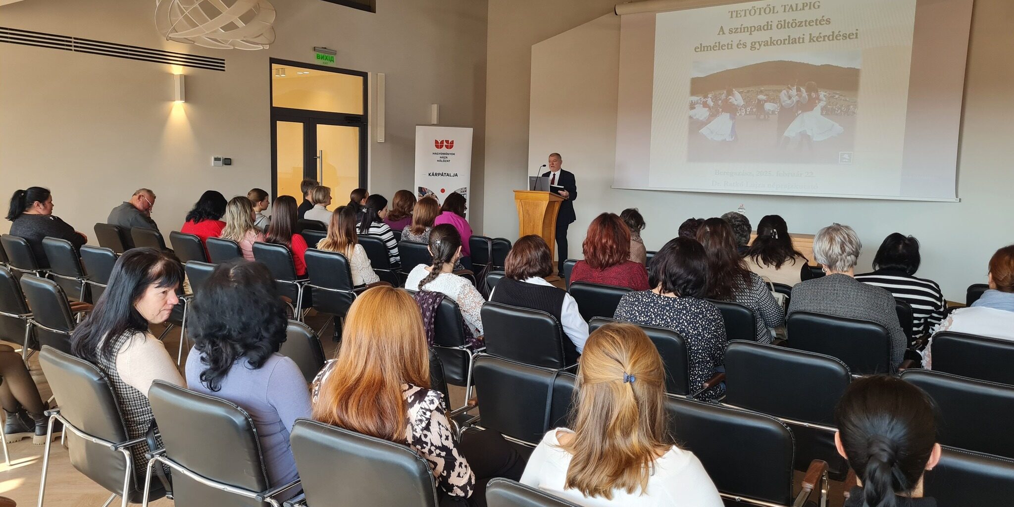 A nagy érdeklődéssel kísért elméleti előadást dr. Ratkó Lujza néprajzkutató tartotta, felszólalásában viselettörténeti és kronológiai áttekintést osztott meg a hallgatósággal. Külön kitért a hiteles színpadi viselet jellemzőire: a hitelességre, az esztétikusságra, az igényességre és a praktikusságra is. A történeti fejezetnél kiemelte az 1931–1944 között működő Gyöngyösbokréta mozgalom korszakalkotó szerepét, ami a pozitívumok mellett hozzájárult bizonyos sztereotípiák kialakulásához is. Megállapította, hogy a háború után a sematikus, stilizált „népi” időszak került előtérbe, s majd csak a táncházmozgalom hatására kerültek előtérbe a hiteles viseletek. Napjainkban a modern és posztmodern irányzatok korát éljük, a hagyomány mint fogalom átértékelődik. A résztvevők megállapították, hogy Kárpátalja a már említett sematikus koraszakot éli, s lemaradásban van a többi országrésszel összevetve. Az előadó megjegyezte hogy a népszerű nemzeti színeket hangsúlyozó ’magyar ruhának’ ugyan nem sok köze volt a népi kultúrához, ugyanakkor az identitás erősítésében betöltött szerepe elvitathatatlan. A kárpátaljai helyzet – az ismert okok miatt polgárai számára – napjainkban nehezen alkalmas a hagyományok ápolására, de az előadó biztatta a jelenlévőket, hogy az almáriumokban lapuló régi fotók alapján rekonstruálják az adott tájegység viseleteit.