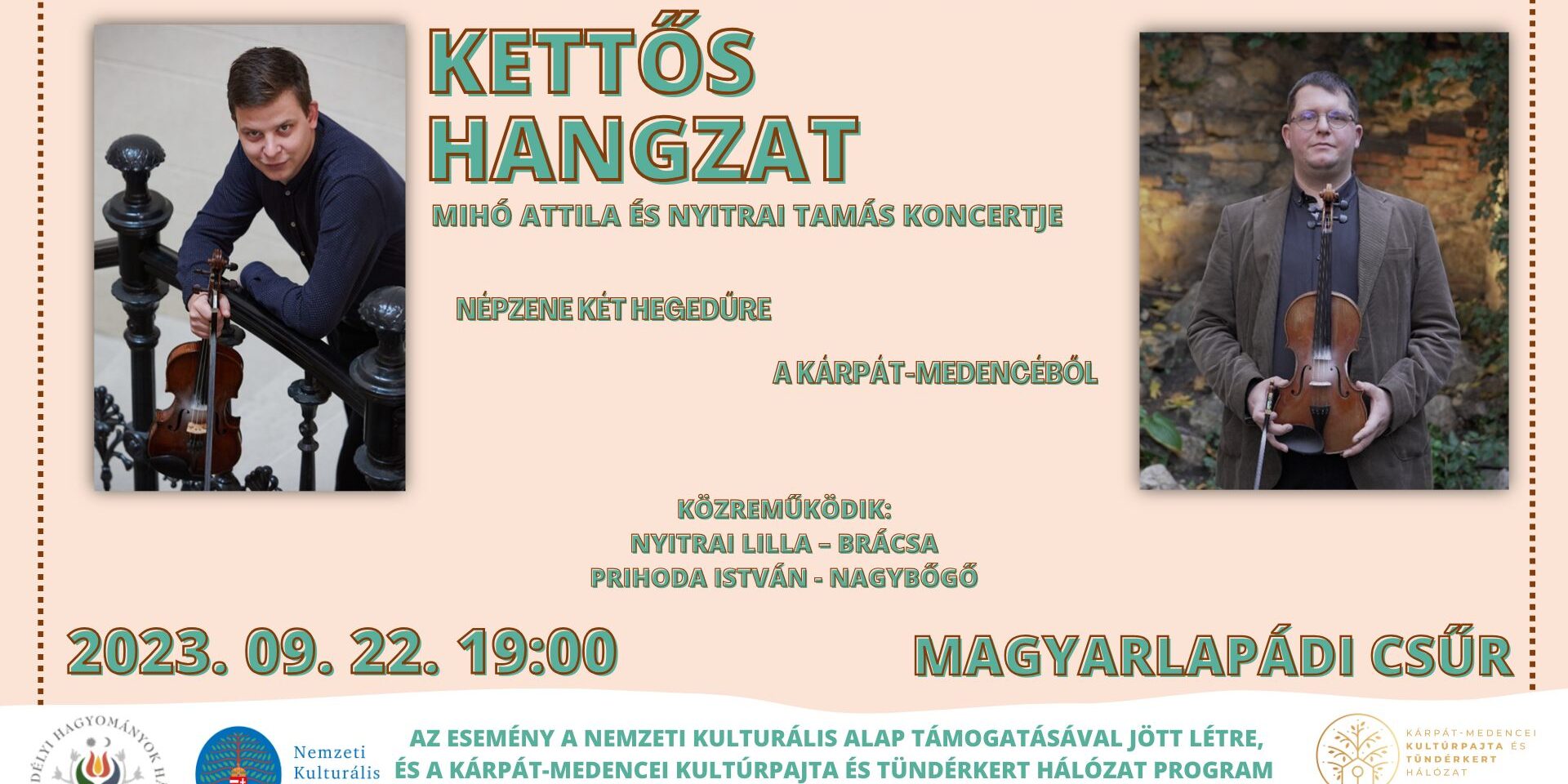 Magyar népzenét bemutató sorozatunk második estéjén Mihó Attila és Nyitrai Tamás koncertjét hallgatjuk meg. „Kettős Hangzat” címet viselő alkotásukban két hegedű egymással megszülető viszonyát figyelhetjük meg a Kárpát-medencei népzenében. Az esten közreműködik Nyitrai Lilla brácsán, valamint Prihoda István nagybőgőn.